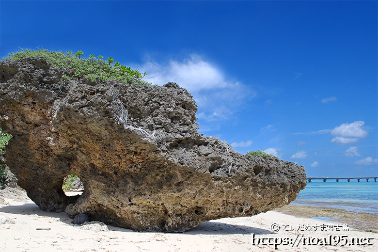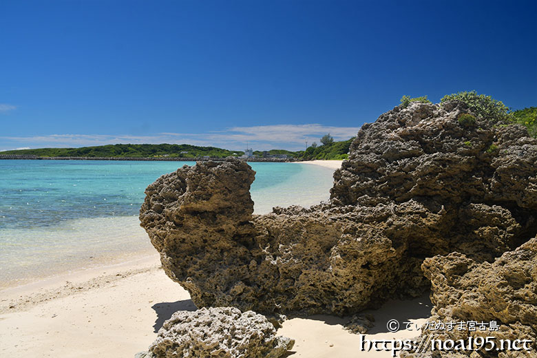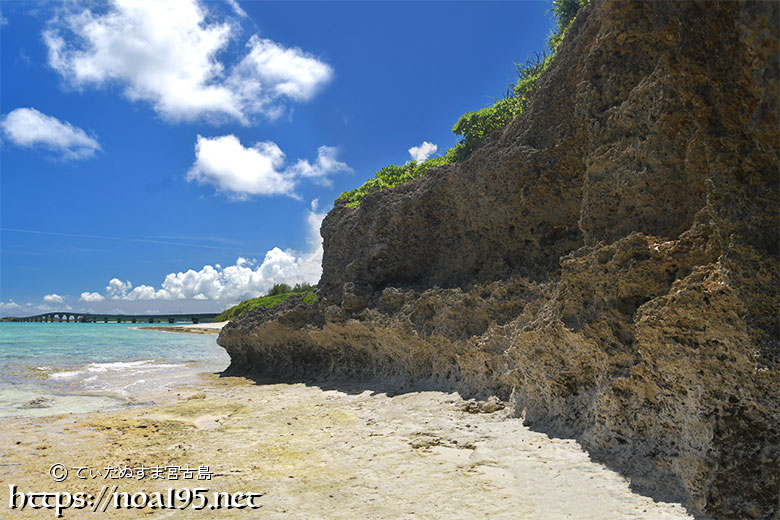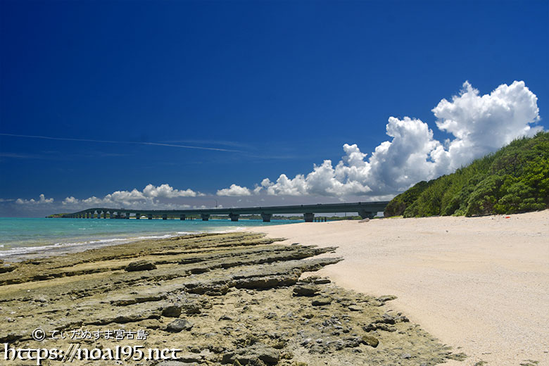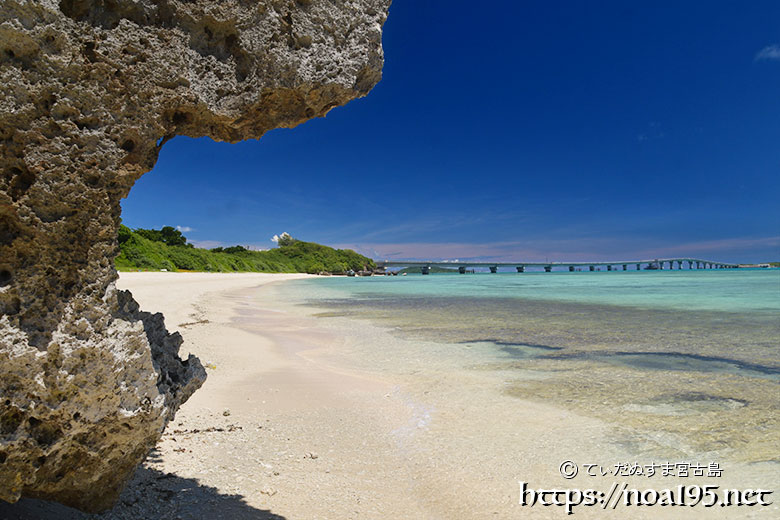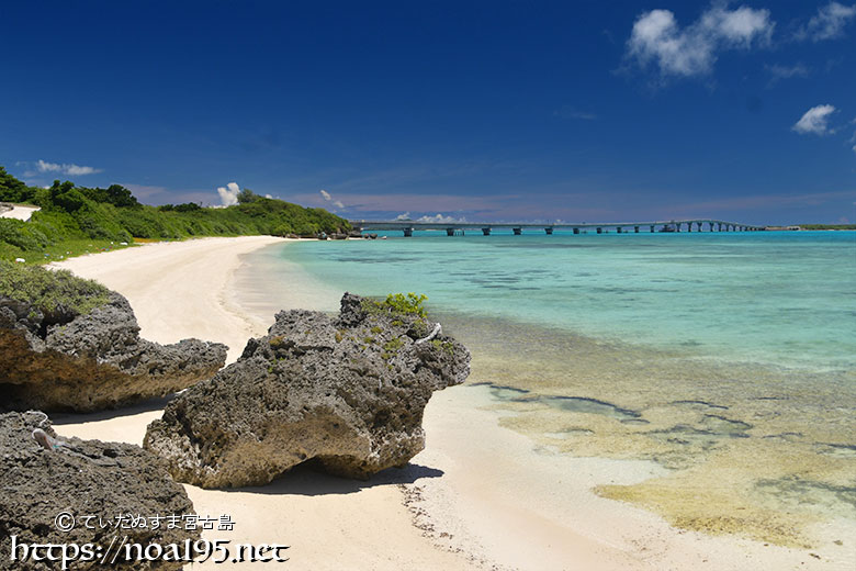 ビーチの右端にはマサカダツのごつごつとした岩と池間大橋。