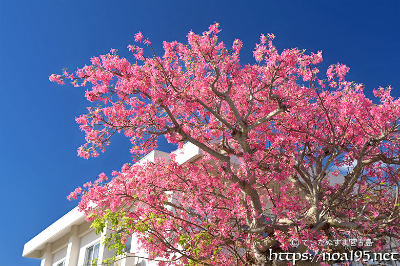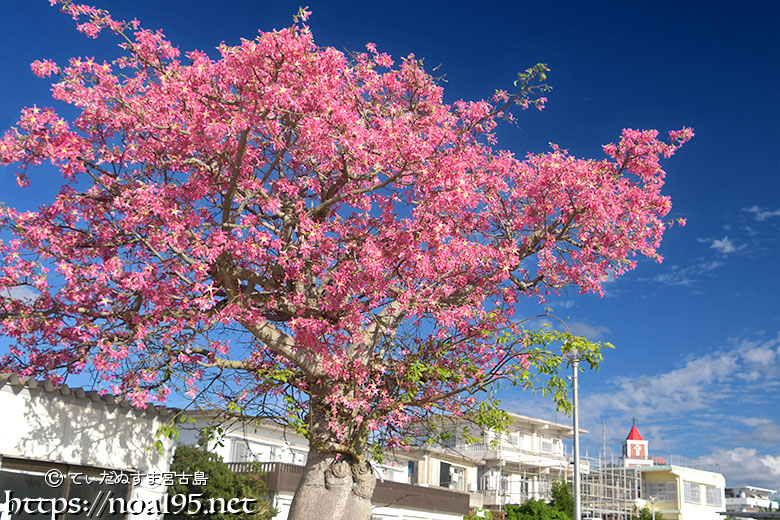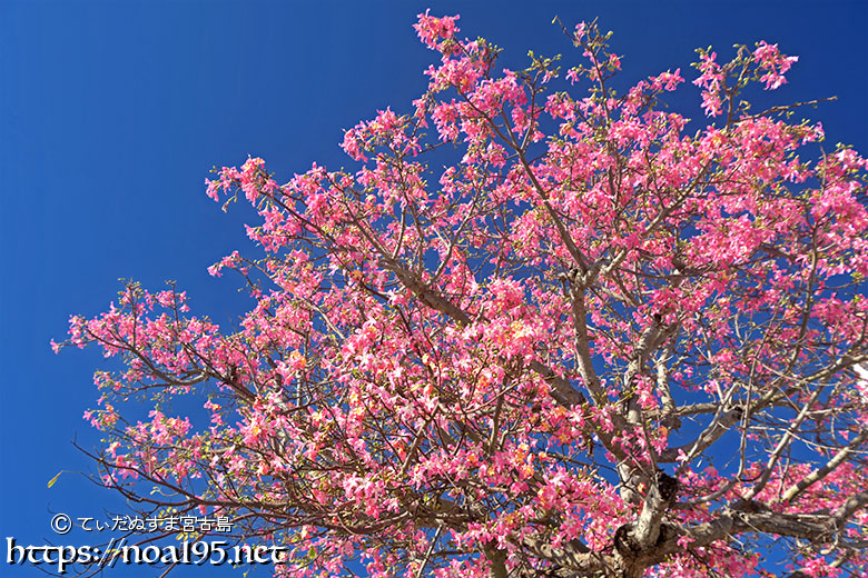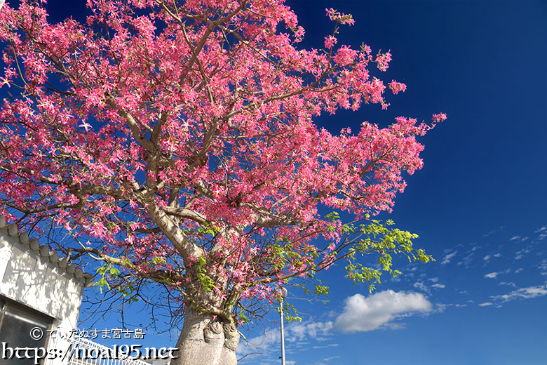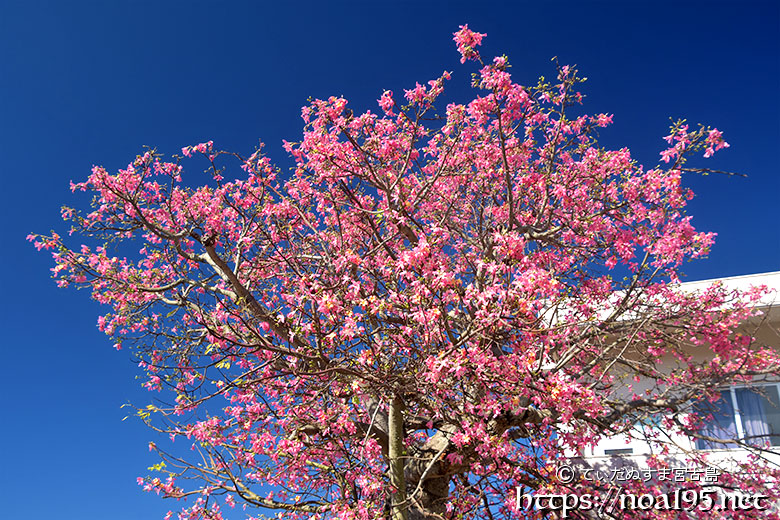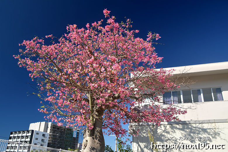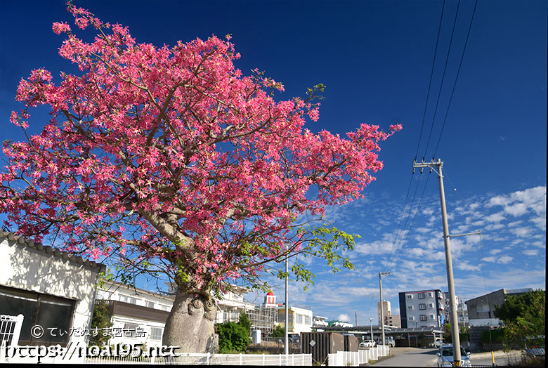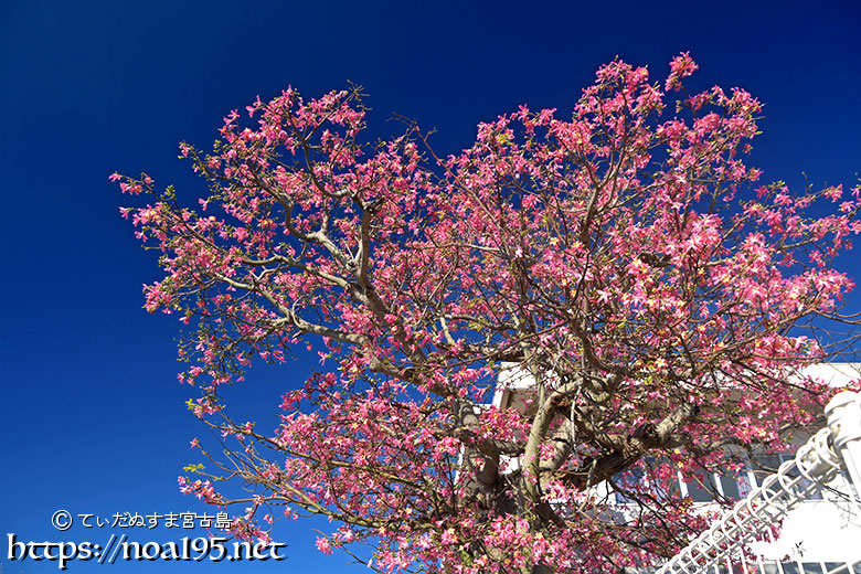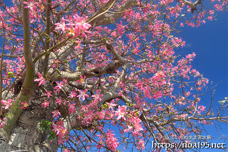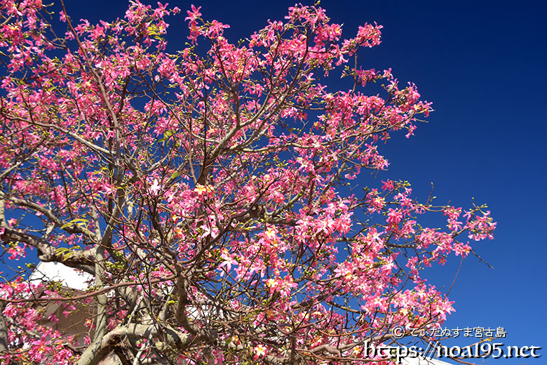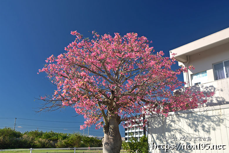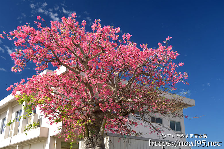 通りがかった近所の人に「きれいですねー」と声をかけると「宮古島の桜だよ。花が散った後にはほわほわの綿みたいなのができるよ」と教えてくれました。