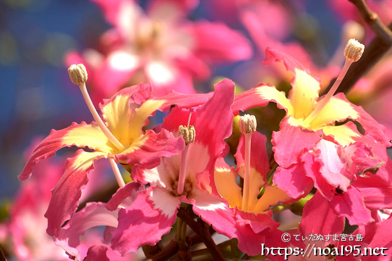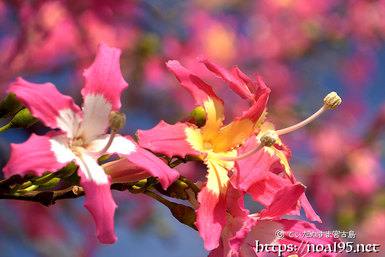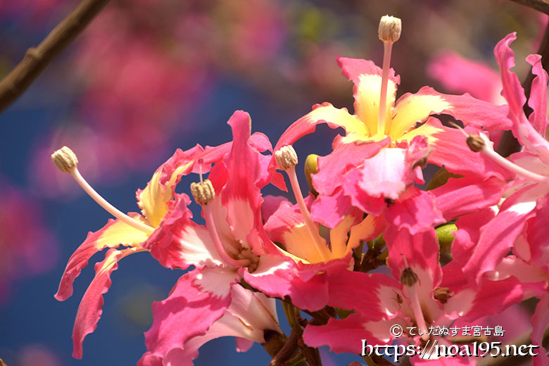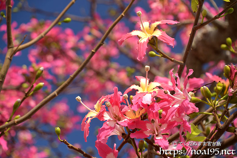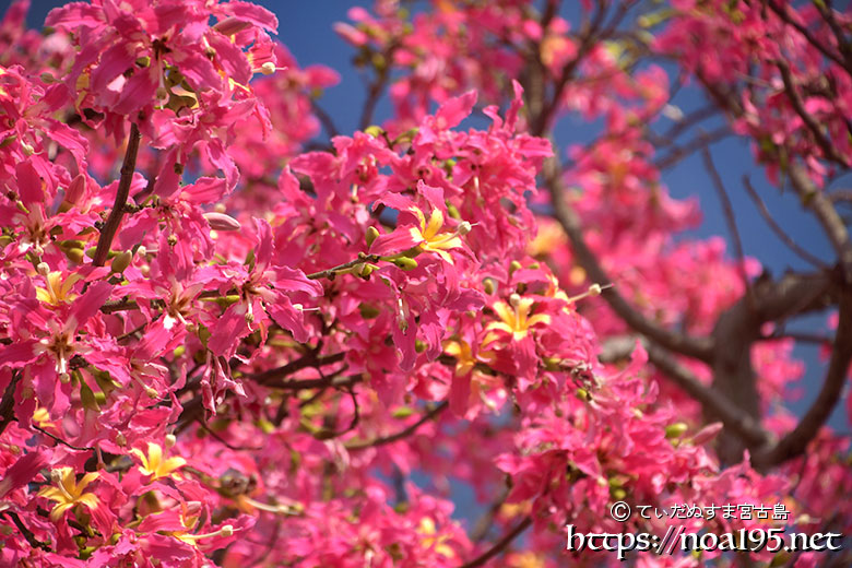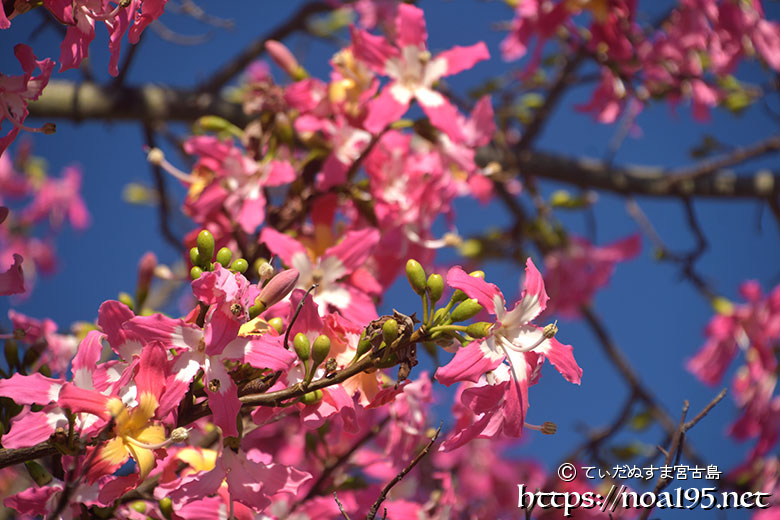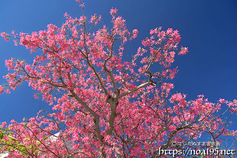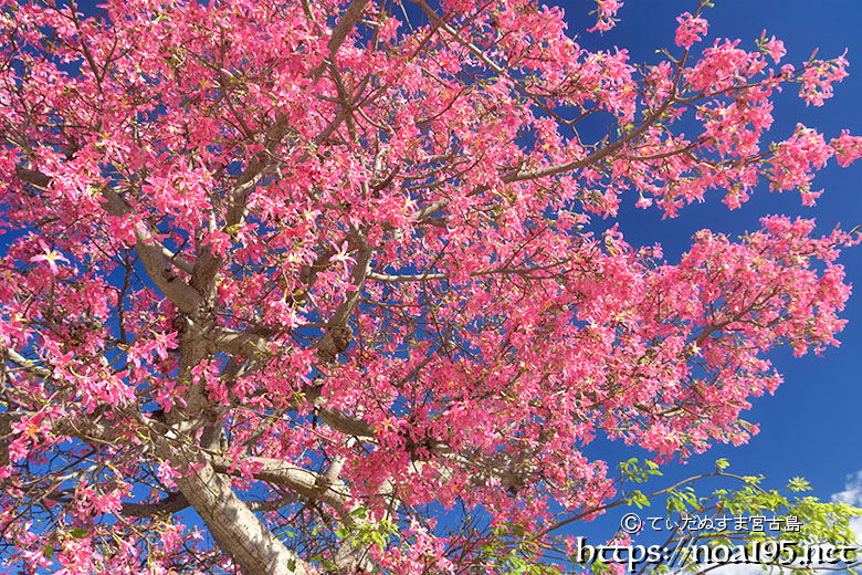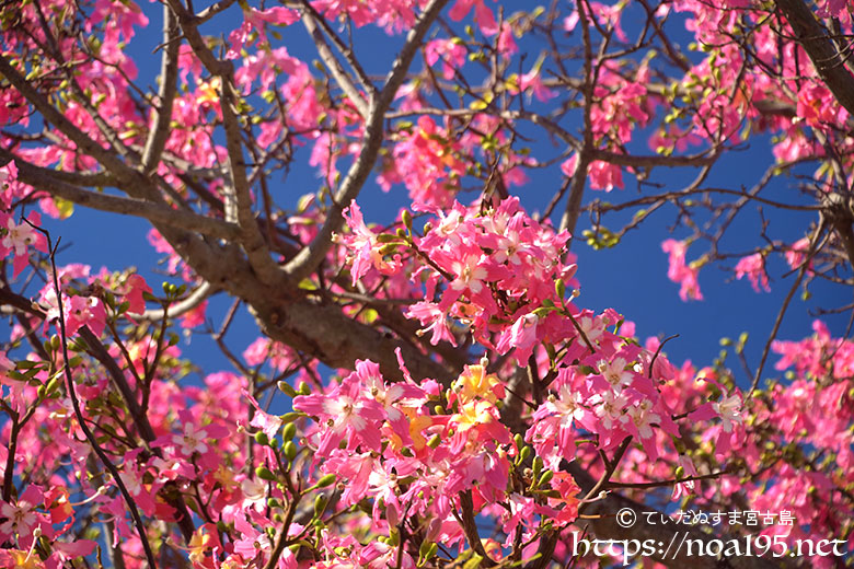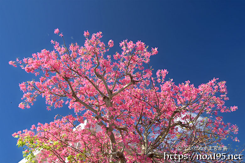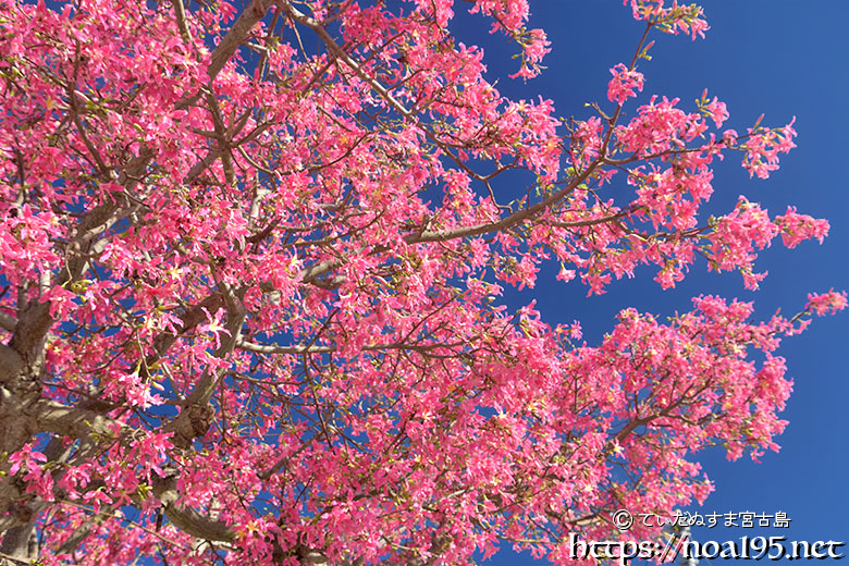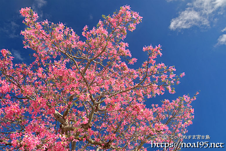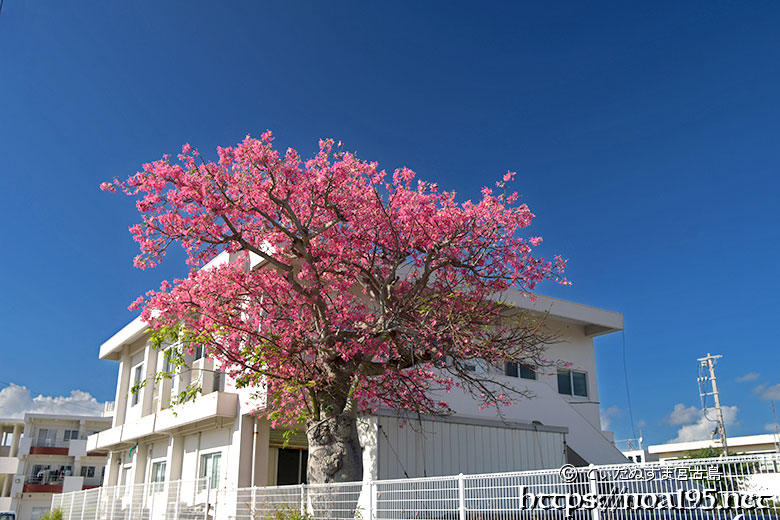 通りがかった近所の人に「きれいですねー」と声をかけると「宮古島の桜だよ。花が散った後にはほわほわの綿みたいなのができるよ」と教えてくれました。