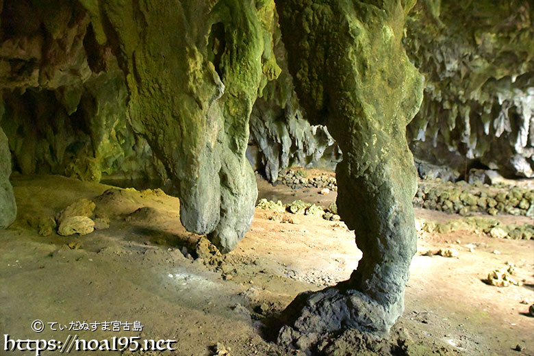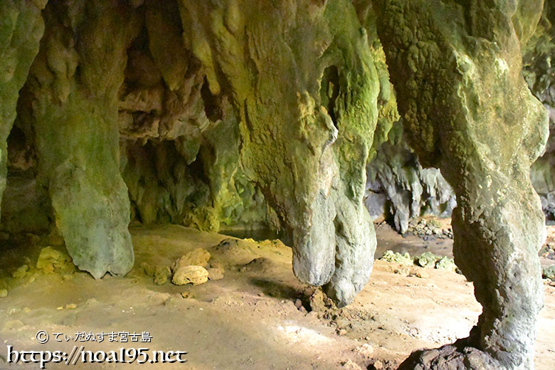 天井からは何本もの鍾乳石がまるで柱のようにのび、一部は地面にまで届いています。